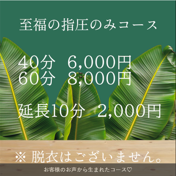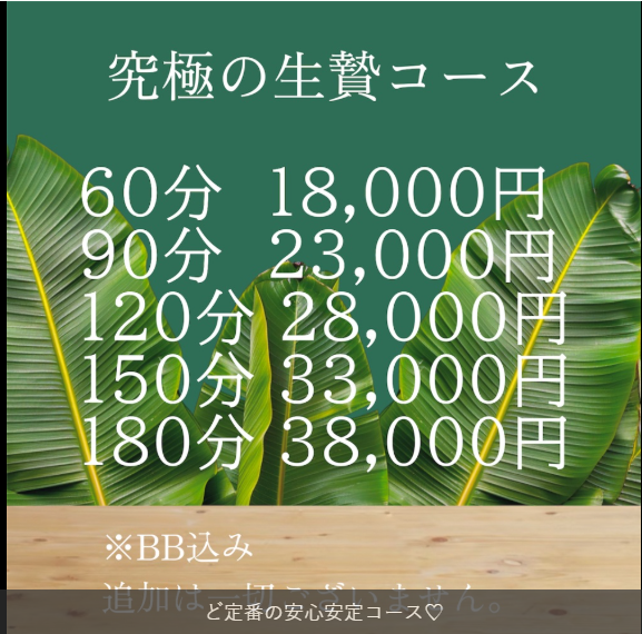 | コース料金 | 60分 18000円 90分 23,000円 120分 28,000円 150分 33,000円 180分 38,000円 |